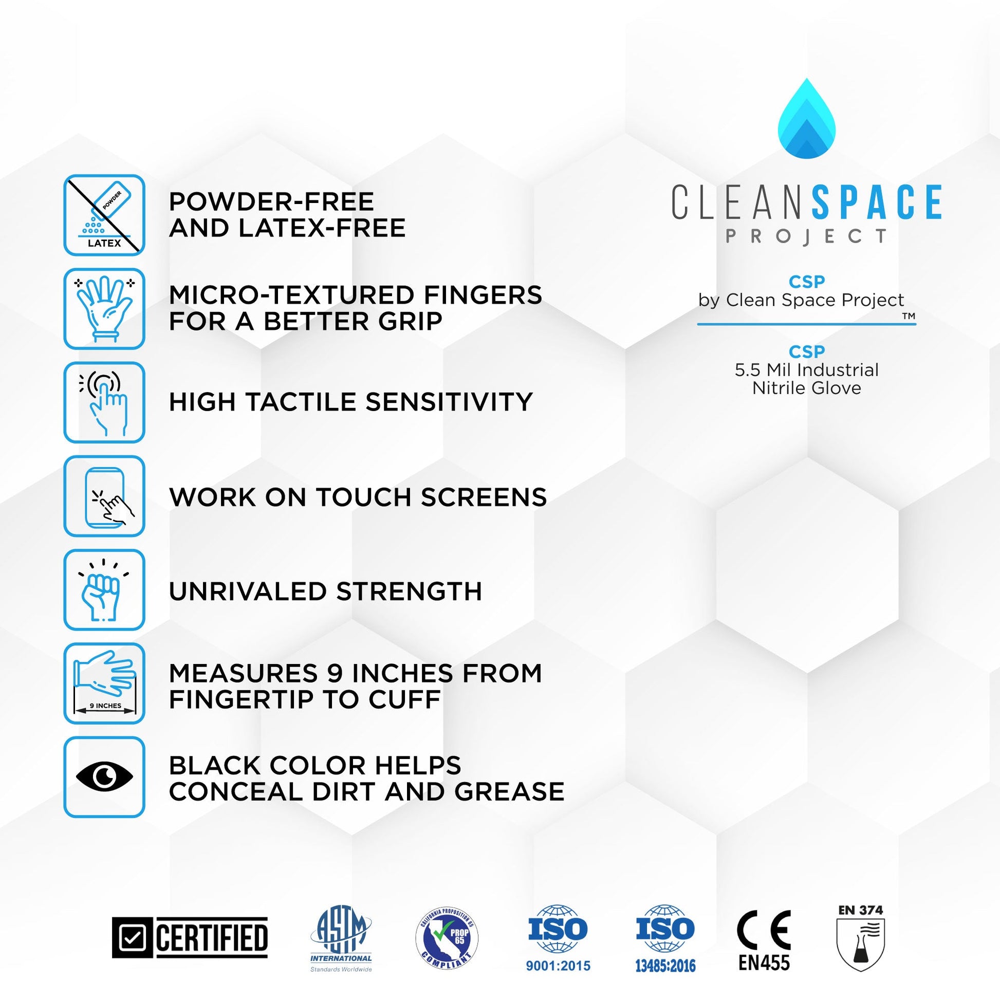 • ASTM 6978 • Proposition 65 • EN 455 and EN 374 • ISO 9001-2015 • ISO 13485-2016