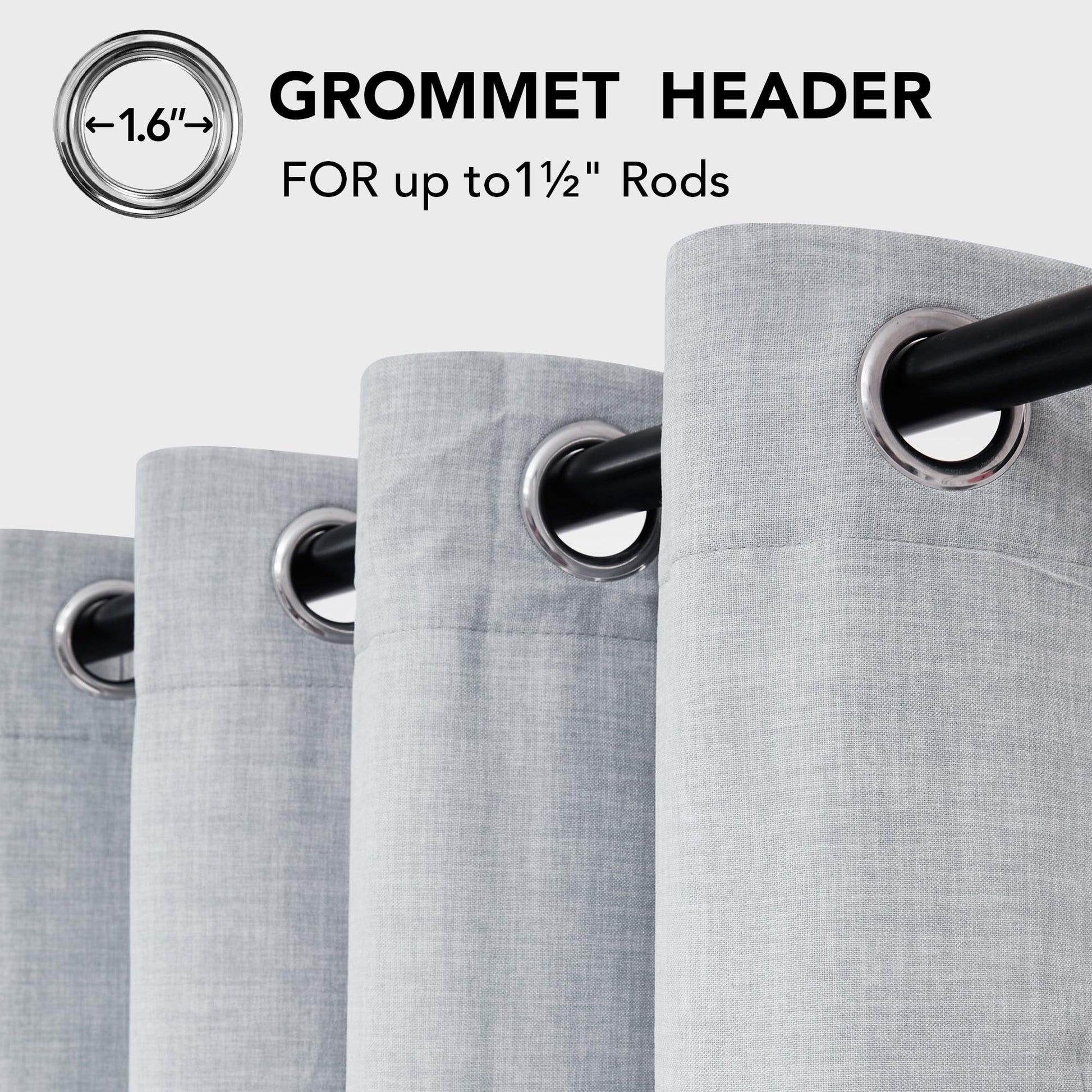 Includes 2 faux linen curtain panels, each measuring 52” W x 63” L (104” wide total). Each panel features 8 silver metal grommets with 1.5-inch inner diameter for easy hanging and smooth glide. -