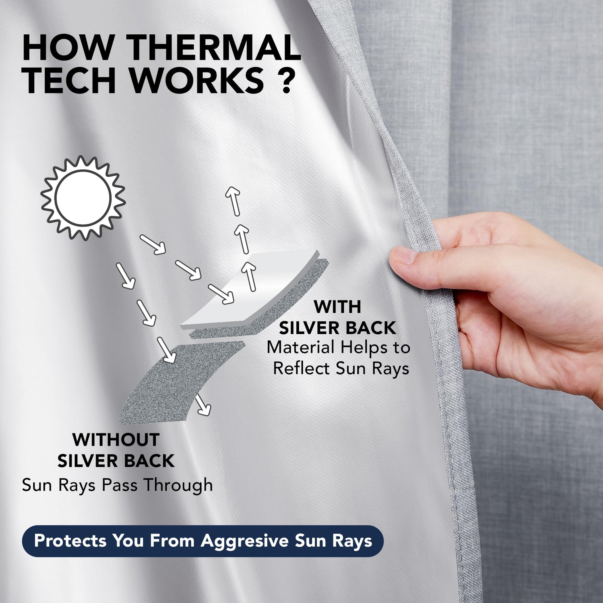 Thermal curtains with silver TPU backing reflect sun and heat (not blackout curtains), protecting against UV rays and keeping the room cooler without darkening it completely. They insulate by keeping heat out in summer and retaining it in winter. -