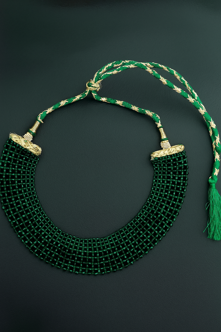 Elegant Green Beaded Necklace with Gold Accents and Tassel Closure