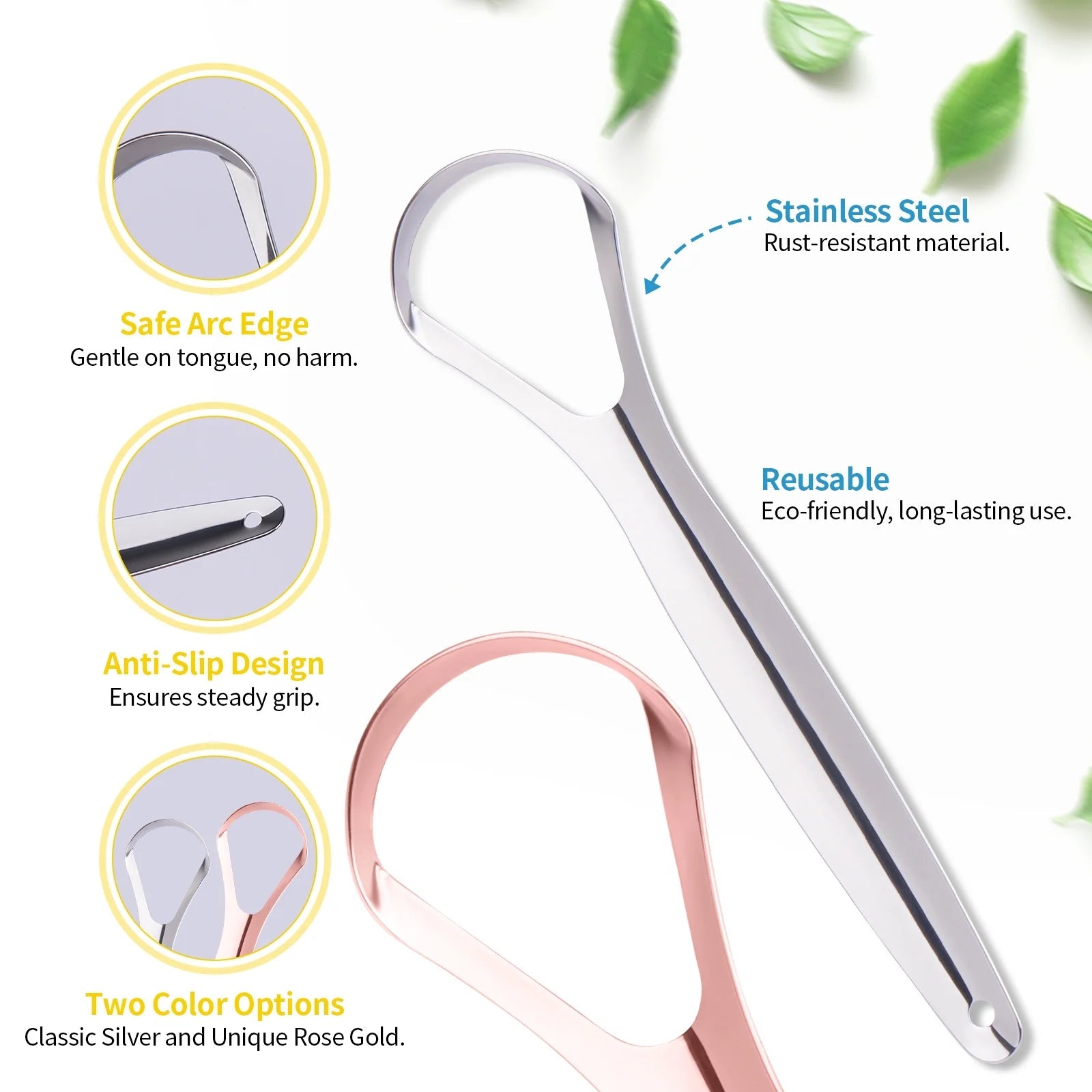 TWO COLORS TO CHOOSE: This type of tongue cleaner is available in two stylish colors, silver and rose gold, to meet different people's preferences, easy for family members to distinguish between personal tongue scraper.