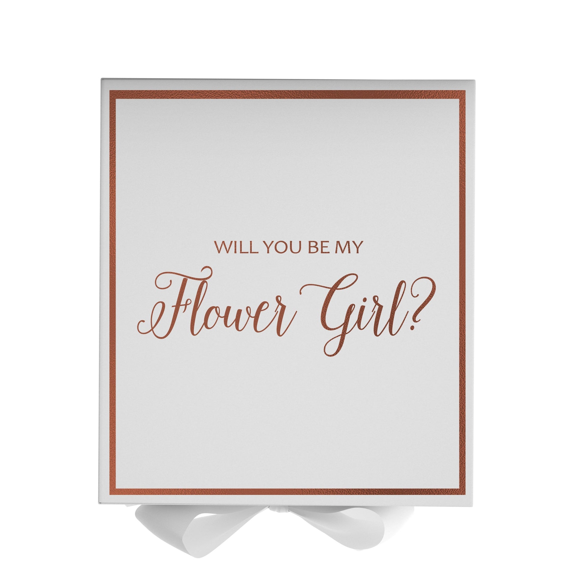 Will you be my Flower Girl, gift box only, metallic writing on lid of box, white box, with White Bow. - Border