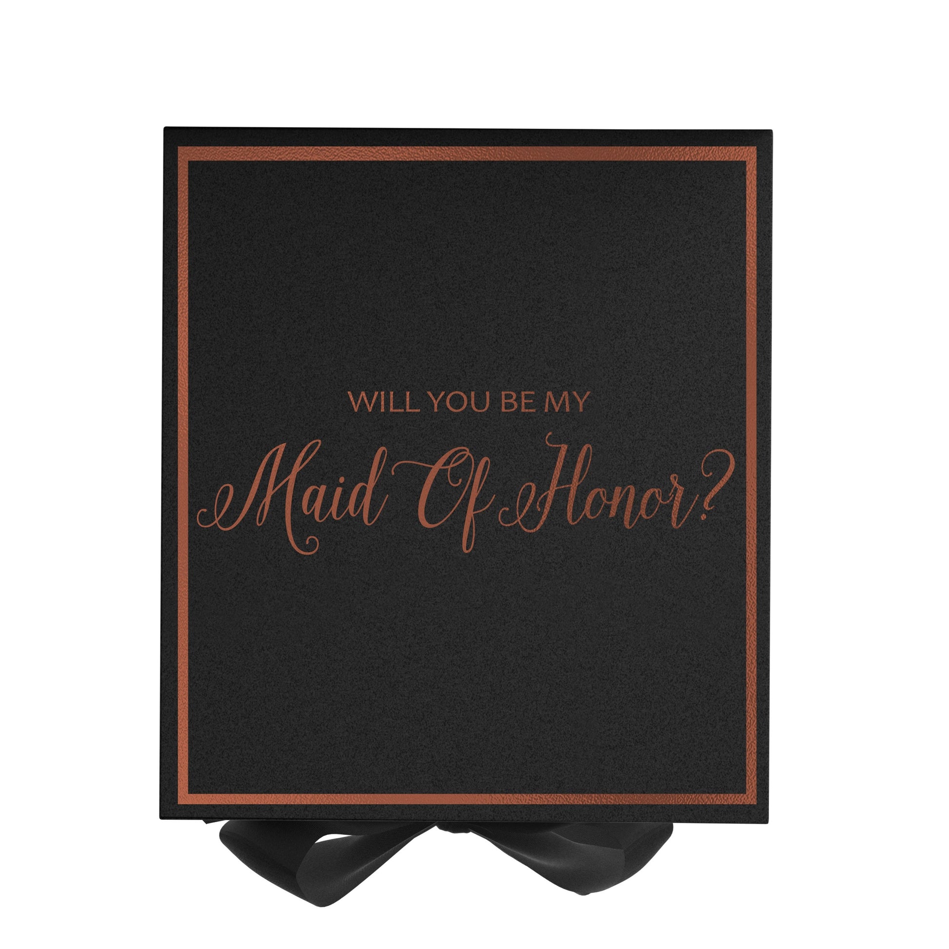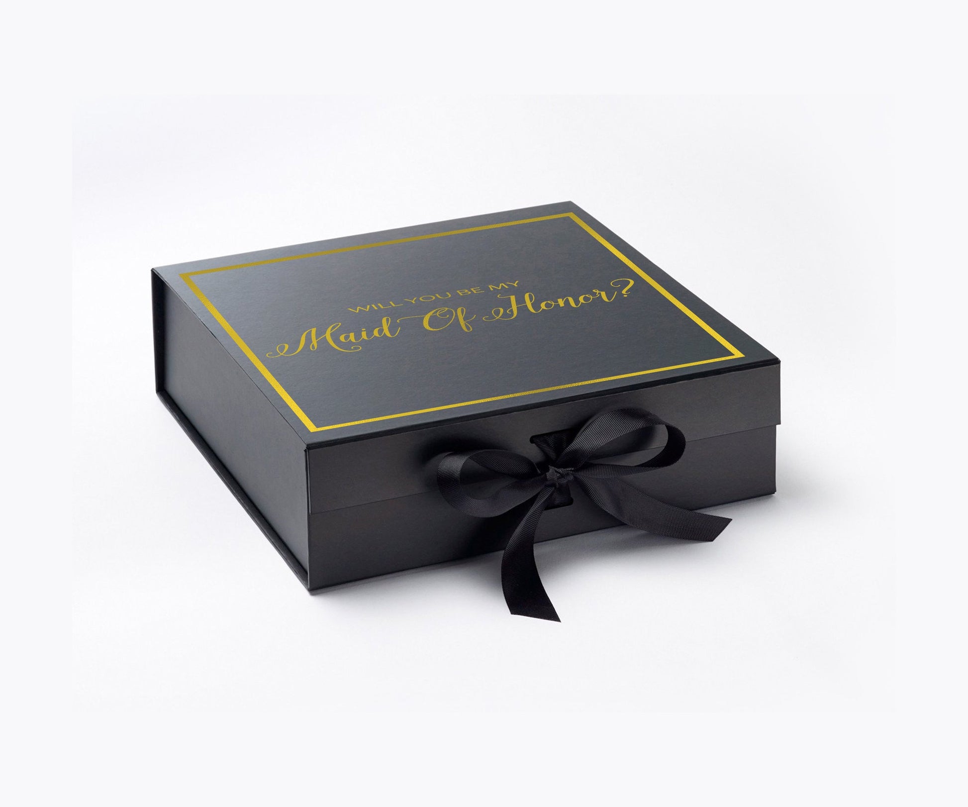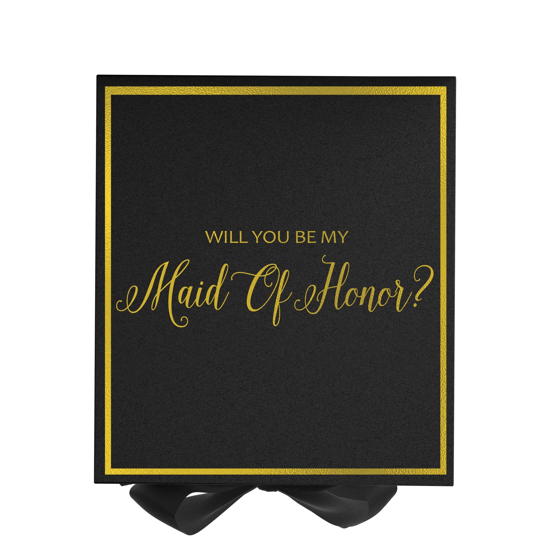 Will you be my maid of honorr, gift box only, metallic writing on lid of box, black box, with black Bow. - Border
